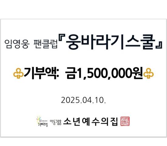 임영웅 팬클럽 '잠실 웅바라기스쿨', 소년예수의 집에 150만 원 기부
