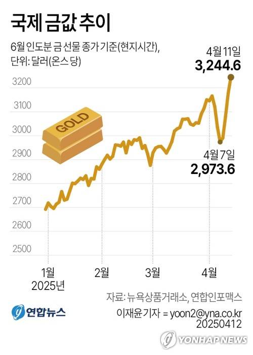 (서울=연합뉴스) 이재윤 기자 = 도널드 트럼프 미국 대통령의 관세정책 불확실성이 지속되는 가운데 달러화가 약세를 보이면서 11일(현지시간) 국제 금값이 온스당 3천200달러대로 올라서며 사상 최고치를 다시 경신했다.
