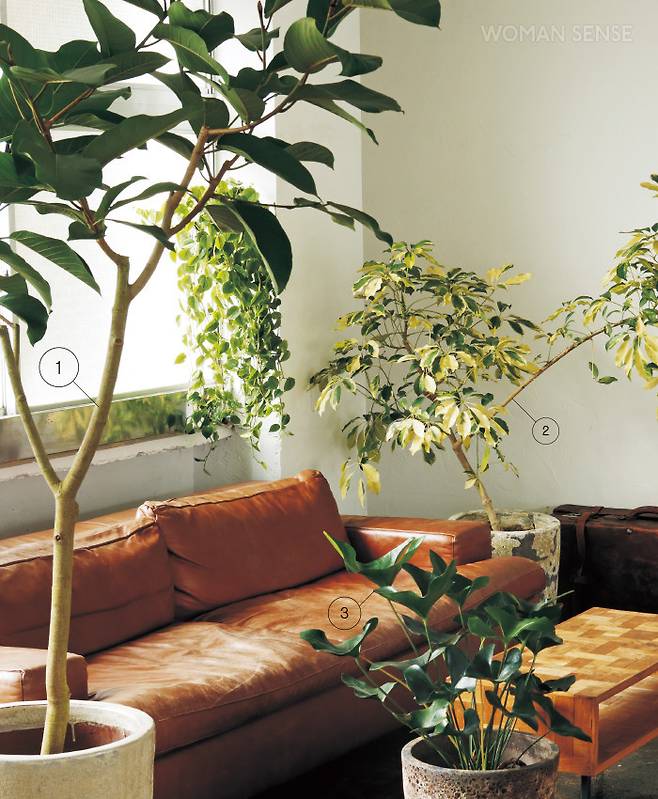 사람이 오래 머무르는 거실은 식물의 변화를 바로 알아채고 돌볼 수 있는 공간이다. 소파 곁에 있는 ①자바고무나무는 공간에 확실한 인상을 심어준다. 키가 선반 높이쯤 되는 ②쉐플레라 다즐은 싱그러운 분위기를 더하고, 낮은 탁자와 어울리게 둔 ③안스리움 애로는 반그늘을 좋아해 창문에서 조금 떨어진 곳에 배치하는 게 좋다.