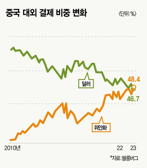 중국 위안화 부상은 주목할 만하다. 중국은 위안화 국제 결제 시스템 ‘CIPS’를 통해 위안화 결제 비중을 높이며 달러 의존도를 줄이고 있다. 블룸버그 산하 경제연구소 블룸버그인텔리전스가 중국 국가외환관리국(SAFE) 통계를 분석한 결과 이미 2023년 3월 중국 대외 거래에서 위안화가 차지하는 비중은 48.4%를 기록했다. 2010년 0%에 가까웠던 위안화 비중이 10여년 새 빠르게 늘어난 것이다. 반면 같은 기간 달러 비중은 83%에서 46.7%로 감소했다.