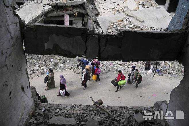 [가자시티=AP/뉴시스] 이스라엘군(IDF)이 가자지구 동부에 대피령을 내린 가운데 11일(현지 시간) 가자시티 동부에서 팔레스타인 난민들이 서부로 이동하고 있다. IDF는 이 지역에서 군사작전 강화를 이유로 긴급 대피령을 내렸다. 2025.04.12.