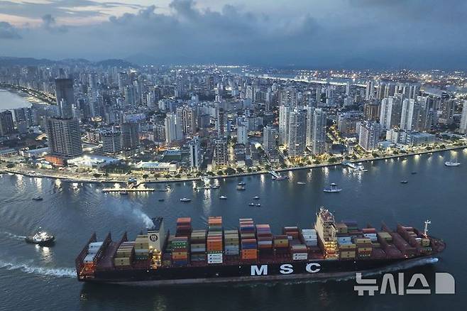 [산투스(브라질)=AP/뉴시스]브라질 산투스항에 지난 1일 컨테이너선 한 척이 접근하고 있다. 세계 최대 해운국들 중 많은 나라들이 11일 기준치를 초과하는 선박 배출 온실가스에 1톤당 최소 100달러(14만2500원)의 수수료를 부과하기로 결정했다. 이는 사실상 온실가스 배출에 대한 세계 최초의 세금이다. 2025.04.12.
