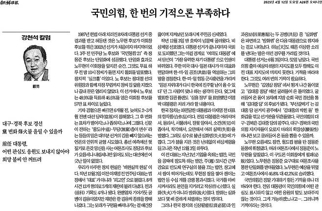 12일 <조선일보>는 "국민의힘, 한 번의 기적으론 부족하다"라는 제목의 칼럼을 지면에 실었다. 칼럼은 강천석 <조선일보> 고문이 작성했다.