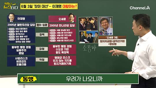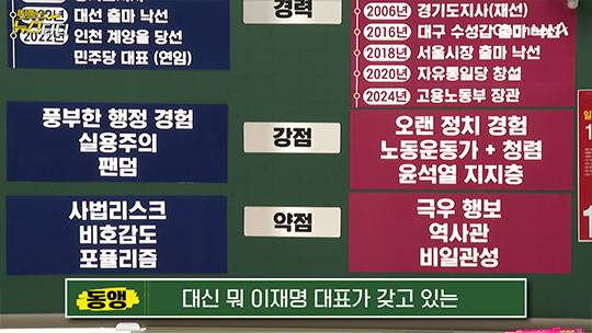 하지만 이게 약점이 되기도 합니다. 노동운동을 하다가 보수 정당에 들어왔고, 보수 정당에 들어와서 정통 보수와 각을 세우는 소장파 역할을 하다가, 가장 극우로 불리는 전광훈 목사와 정당 활동을 했던 비일관성이 약점으로 꼽히기도 합니다.