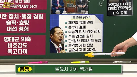 홍준표 시장이 최근 낸 저서에 대선 공약이 담겼는데요. 종부세 철폐, 수능과 정시 위주로 입시 전환, 1년에 수능 2회 실시, 사법고시 부활, 흉악범 사형, 필요시 자체 핵개발 등 홍준표다운 공약들을 내놨습니다.