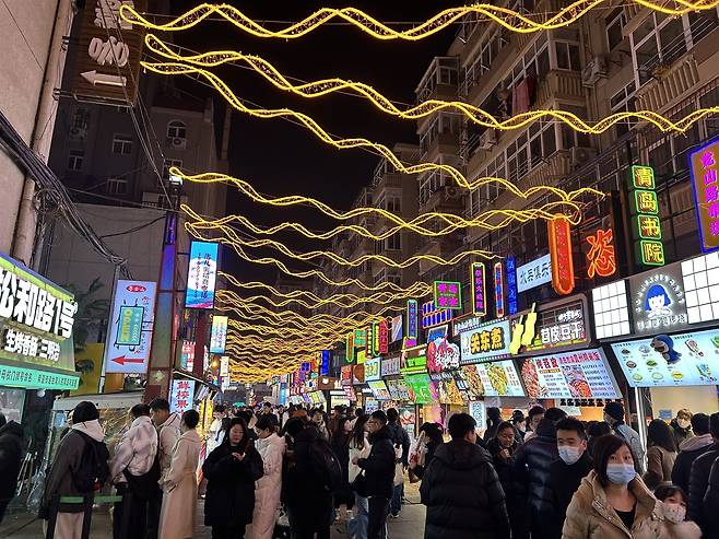 도시에 솟은 빌딩은 서울을 방불케 했다. 마천루 사이를 가득 채운 자동차를 보며 외형적으로 발전한 중국을 체감했다. 앱으로 표시되는 경로는 오차가 없었다. 10분 정도 지났을까, 식당이 즐비한 도로 옆에 차가 멈췄다. 비어스트리트라고 불리는 곳에 도착한 모양이다. 우리에겐 다소 촌스럽게 느껴지는, 형형색색 간판들이 보였다. 지역 음식과 칭다오 맥주를 파는 식당들이었다.