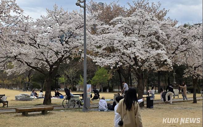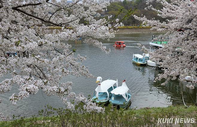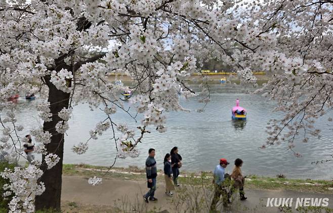 완연한 봄날씨를 보인 12일 춘천시 공지천에서 상춘객들이 벚꽃길을 따라 산책을 하며 여유로운 시간을 보내고 있다.