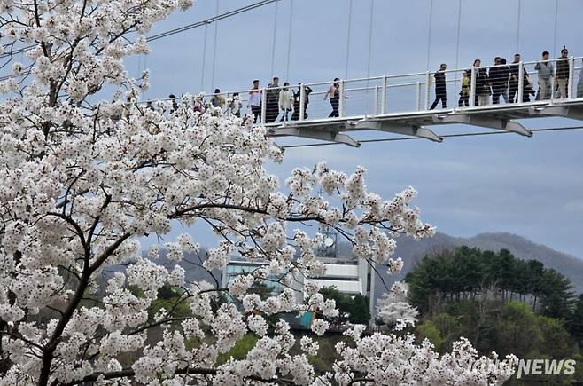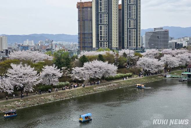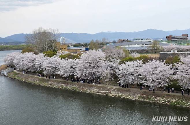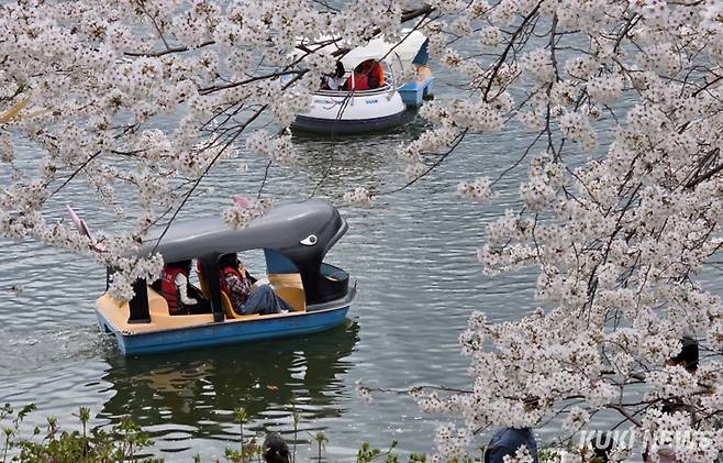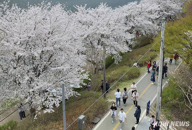 완연한 봄날씨를 보인 12일 춘천시 공지천에서 상춘객들이 벚꽃길을 따라 산책을 하며 여유로운 시간을 보내고 있다.