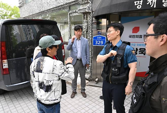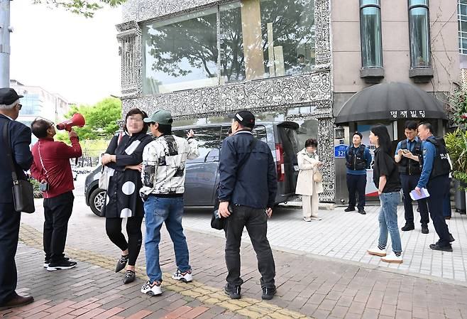 12일 국민의힘 울산남구갑 당원협의회 당원들이 울산시 남구 신정동에 위치한 김상욱 국민의힘 의원 사무실 앞에서 김상욱 의원의 남구갑 당원협의회 운영위원장 사퇴를 요구하는 항의를 하고 있다.