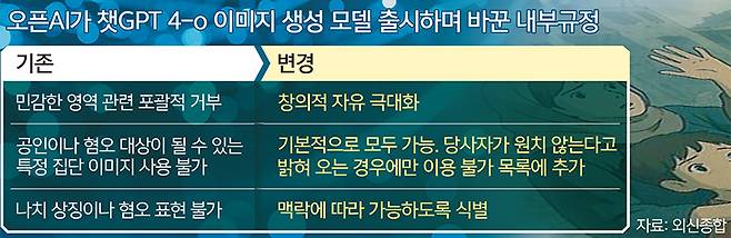 논란은 지브리풍 이미지 생성에서 그치지 않을 전망이다. 오픈AI는 챗GPT 4-o 모델을 출시하면서 민감한 이미지 생성을 제한해온 기존의 자체 규정을 대폭 완화했다. 오픈AI는 “포괄적인 거부에서 창의적 자유를 허용하고 현실에서 실제 피해를 방지하는 데 초점을 맞춘 정밀한 접근으로 전환하겠다”는 입장이지만, 예상되는 우려에 대한 보도가 이어지고 있다.