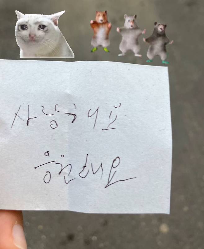 사진은 '사랑해요 응원해요'라고 적힌 쪽지로 뉴진스 멤버가 직접 전달받은 것으로 추정된다.