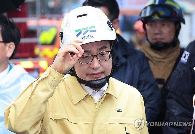 (광명=연합뉴스) 홍기원 기자 = 김동연 경기도지사가 12일 경기도 광명시 신안산선 지하터널 공사장 붕괴 사고 현장을 살펴본 후 나오고 있다. 2025.4.12