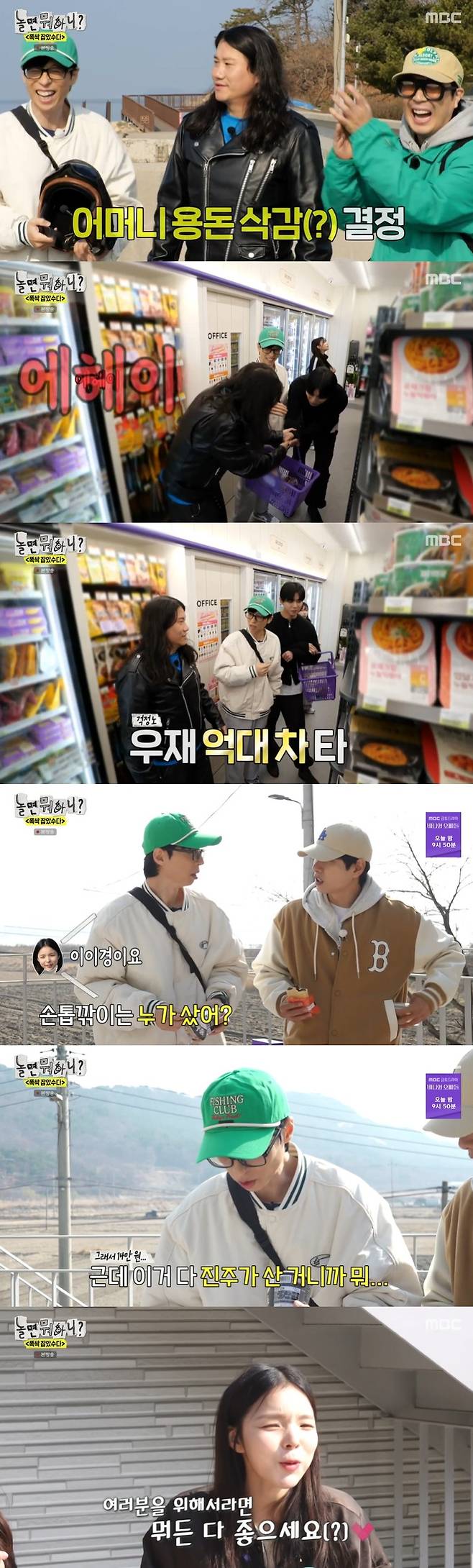 주꾸미 낚시에 앞서 편의점에 들린 멤버들은 배고픔을 호소하기 위해 쇼핑에 나섰다.