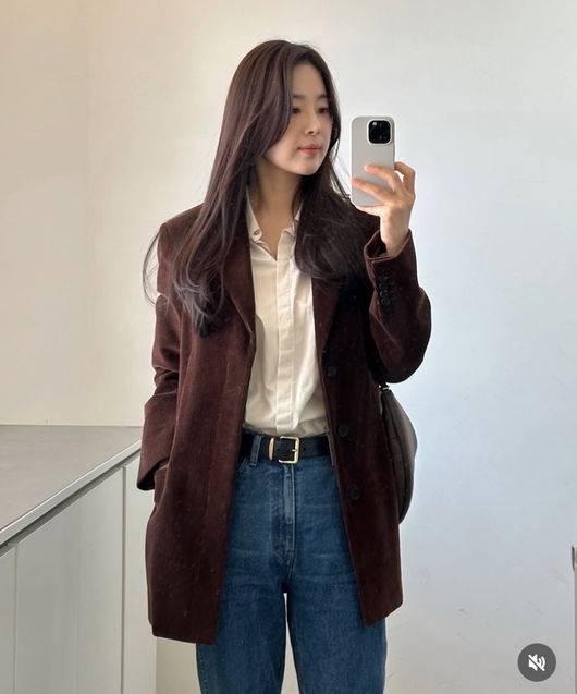 이날 한지혜는 자줏빛이 살짝 감도는 진한 갈색 컬러의 벨벳 재킷에 셔츠, 그리고 통 큰 청바지를 넉넉하게 입은 채 커다란 벨트로 시니컬한 룩을 완성했다.