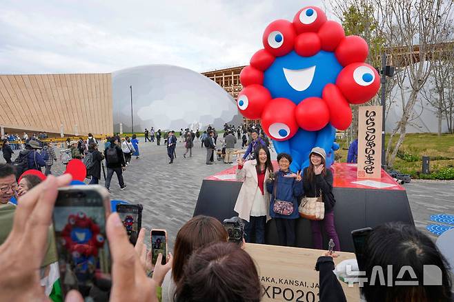 [오사카=AP/뉴시스] 오사카·간사이 엑스포 공식 개막일인 13일 박람회장을 찾은 방문객들이 공식 마스코트 '먀쿠먀쿠' 앞에서 기념 촬영을 하고 있다. 12일 개회식을 마친 이번 엑스포는 '생명이 빛나는 미래 사회의 디자인'을 주제로 오는 10월 13일까지 6개월간 열린다. 2025.04.13.