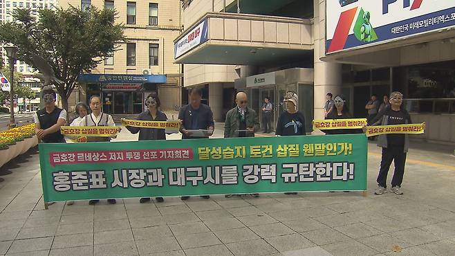 대구환경운동연합, 영남자연생태보존회 등 21개 시민사회단체와 정당이 모인 '금호강 난개발 저지 대구경북공동대책위원회'는 2월 17일부터 공사 현장에서 반대 농성을 벌였습니다.