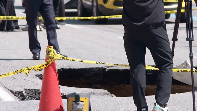 현재 서부도로사업소가 정확한 원인과 피해 규모를 조사하기 위해 싱크홀 현장의 땅을 파고 있습니다.