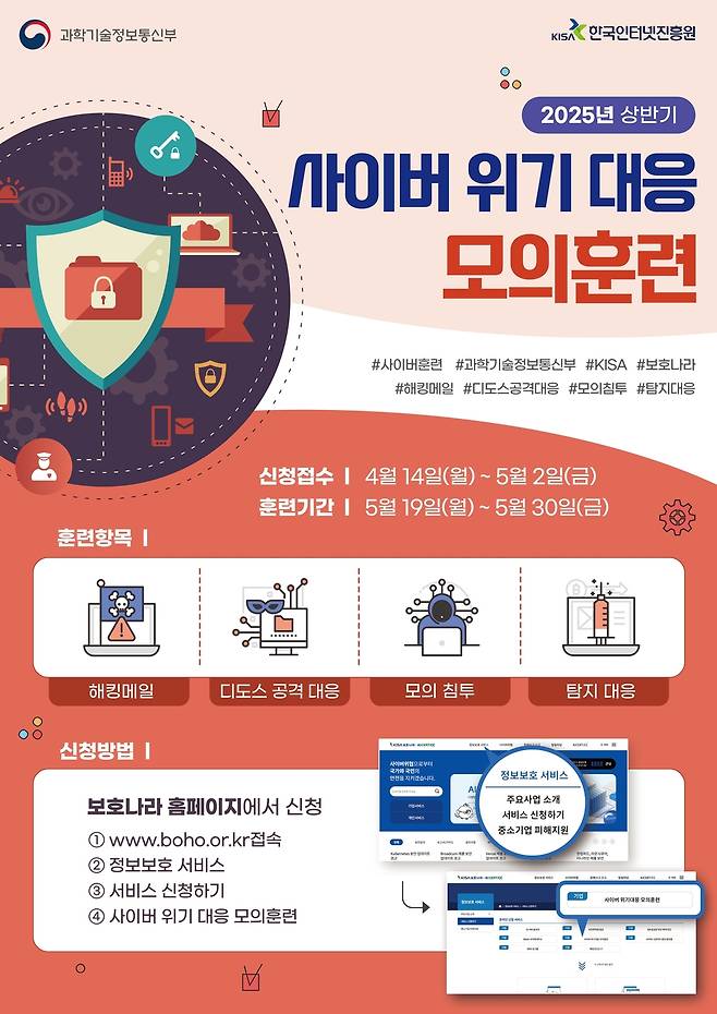과학기술정보통신부와 한국인터넷진흥원(KISA)이 오는 14일부터 내달 2일까지 약 3주간 2025년 상반기 사이버 위기대응 모의훈련 참여기업을 모집한다.
