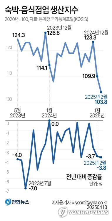 (서울=연합뉴스) 이재윤 기자 = 13일 통계청 국가통계포털(KOSIS)에 따르면 지난 2월 숙박·음식점업 생산지수는 103.8(2020년=100)로 1년 전보다 3.8% 감소했다.