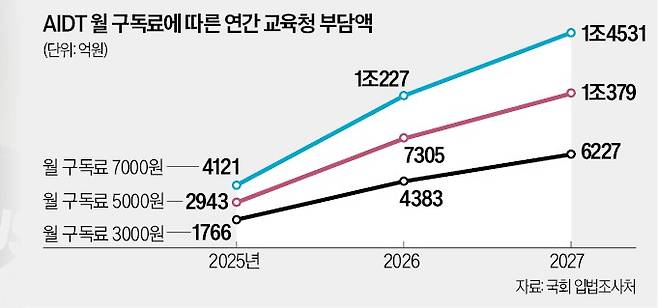 구독료 부담도 AIDT 확대의 걸림돌로 꼽힌다. 전국 17개 시·도교육청은 내년도 AIDT 구독료 예산을 1766억원으로 책정했다. 이는 월 구독료를 가장 낮은 수준인 3000원대로 예측해 산정한 금액이다. 각 학교가 고가 AIDT를 채택하거나 교과서 발행사가 구독료를 인상하면 추가 재정 투입이 불가피할 전망이다.