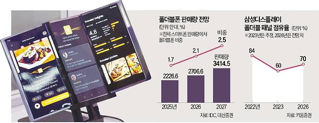 업계에서는 내년 삼성디스플레이의 폴더블폰용 패널 시장 점유율이 70%대로 오를 것으로 예상한다. 삼성은 2022년까지 연간 매출 기준 점유율 80%대를 유지했지만, 중국 업체의 공세에 지난해 50% 아래로 떨어진 것으로 알려졌다.
