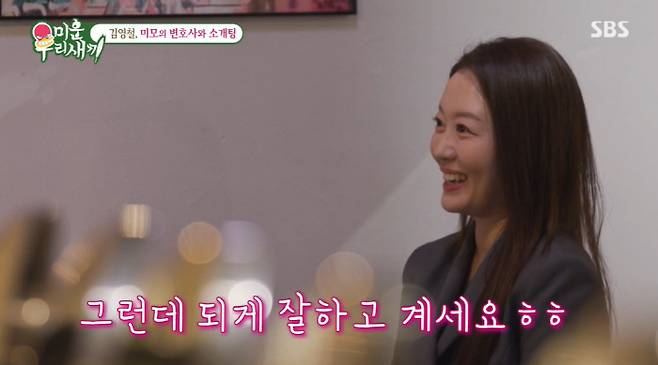미모의 변호사는 김영철을 향해 "실물이 훨씬 났다"며 칭찬, 김영철은 "과찬이시다"며 웃었다. 김영철은 이름을 물어본 뒤 '이승은'이라는 말에 "이승...그러니까...아니다"면서도 "이승은 저승은.."이라며 유머를 선보였다. 결국 누나는 "부끄럽다"고 했고, 서장훈도 "가만히 있어라"고 해 웃음을 안겼다.