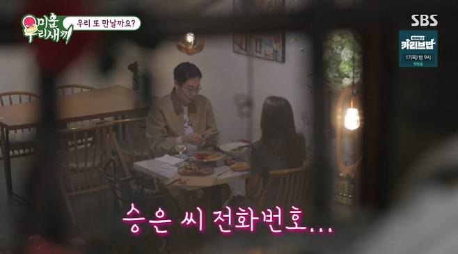 그때 김영철은 "주말 하루는 쉬고 하루는 일 한다. 커피숍가서 책 보는 거 좋아한다"는 말에 "그러면 다음에 만나서 같이 책 볼래요?"라며 자연스럽게 애프터 신청을 했다. 이에 이승은은 "좋다"며 웃었다. 이어 전화번호까지 교환에 성공했다.