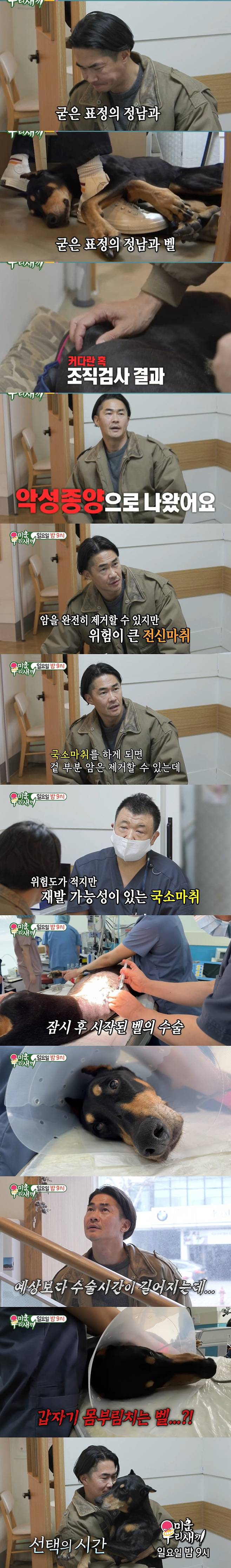 굳은 표정의 배정남과 지친 듯 배정남 곁에서 쉬고 있는 벨. 그때 의사는 "커다란 혹 조식검사 해봤더니 악성 종용으로 나왔다"고 해 충격을 안겼다.