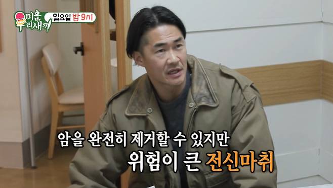암을 완전히 제거할 수 있지만 위험이 큰 전신마취. 배정남은 "전신마취 했을 때 말하는 거냐"며 걱정했고, 의사는 "국소마취를 하게 되면 겉 부분 암은 제거할 수 있는데 재발할 수 있다"고 했다.