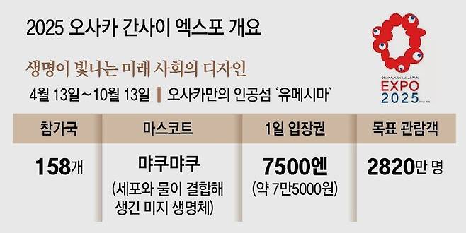 이번 엑스포는 이날부터 10월 13일까지 184일간 열린다. 한국 미국 등 전 세계 158개국과 유엔 등 7개 국제단체가 참가해 각각 전시관을 열었다. 주제는 ‘생명이 빛나는 미래 사회의 디자인’이며 세포와 물이 결합해 생긴 미지 생명체 ‘먀쿠먀쿠’가 마스코트다. 하루 전 개회식 때는 이시바 시게루(石破茂) 일본 총리, 나루히토(徳仁) 일왕과 마사코(雅子) 왕비 부부, 각국 관계자 등 약 1300명이 참석했다.