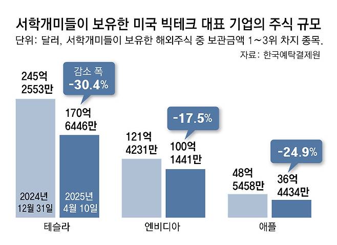 미중 관세전쟁 등의 여파로 올해 들어 100여 일 만에 '서학개미'(해외 주식에 투자하는 개인)가 보유한 테슬라, 엔비디아, 애플 주식 보관액이 26% 감소했다.