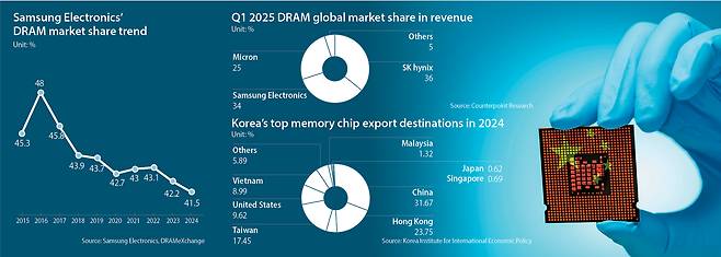 Samsung Electronics held undisputed leadership in the memory chip sector until very recently, when competitors at home and in China began turning the tide. One well-known disrupter is SK hynix, a Korean rival that snatched the top spot in market share of dynamic random access memory (DRAM) in the first quarter thanks to its high bandwidth memory supply to Nvidia.