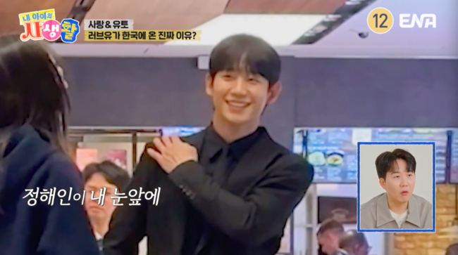 사랑이는 “어떡하지? 말 걸고 싶어”라고 했고, 유토에게 함께 가줄 것을 부탁했다. 두 사람은 용기를 내 발걸음을 옮겼고, 정해인 역시 사랑이와 유토를 알아보고 반갑게 인사했다. 이에 사랑이는 “진짜 연기자 (정해인) 맞냐”라고 물었고, 정해인은 “맞다”라고 웃었다.