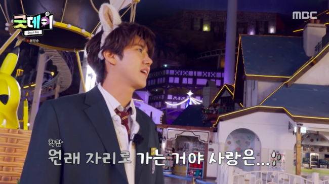 어느덧 12시가 넘어가고, 두 사람은 회전목마에 탑승 중인 정형돈을 발견했다. 이때 가장 먼저 알아본 지드래곤은 곧장 달려가 드라마 ‘천국의 계단’ 속 명장면을 재현했다. 그런 모습을 본 광희는 “그래 사랑은 돌아가는 거지. 원래 자리로 가는 거야. 사랑은”이라고 씁쓸해했다.