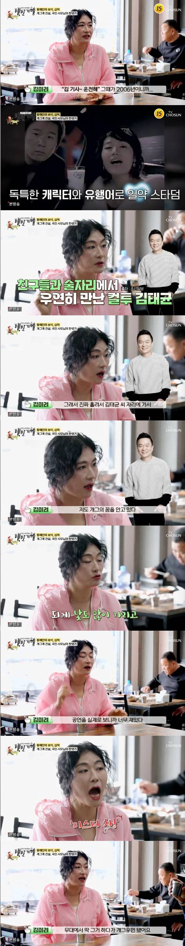 김미려는 "친구들끼리 '우리 오늘 학교 빠지자' 하고 술 한 잔 먹는데 컬투 김태균 오라버니가 다른 개그맨들과 들어오더라. 슬로우로 보였다. 뭔가 홀려서 김태균 씨 자리에 가서 '나도 개그의 꿈을 안고 있다'라고 했다. 사실은 아니었다. 되게 낯도 많이 가리고 공연장에 공연을 보러 오라고 하더라. 그래서 갔다. 실제로 보니 너무 재밌더라. 끝나고 대뜸 준비한 거 보여달라고 하더라"라고 말했다.