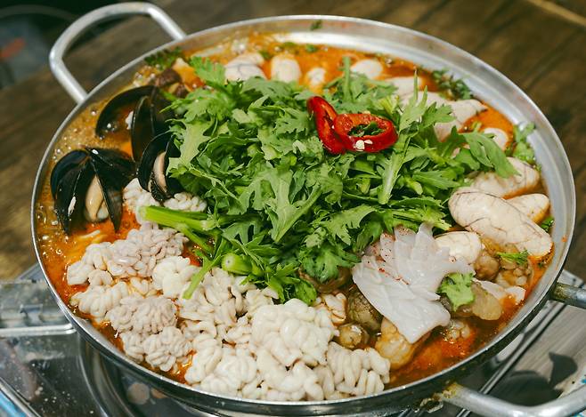 곤이와 이리, 홍합, 오징어 등을 둥글게 배치하고, 위에 쑥갓을 올린다. 사진 찍게 되는 구성이다. 1인분도 꽤 푸짐한데, 안주로 먹을 요량이라면 곤이 & 이리를 추가할 수도 있다.