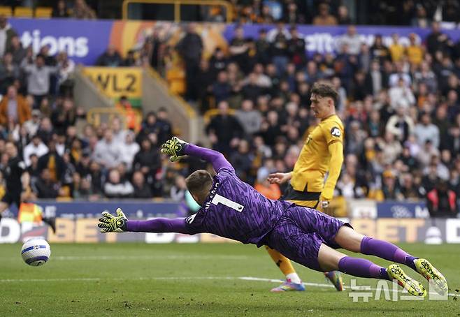 [울버햄프턴=AP/뉴시스] 울버햄프턴 원더러스의 예르겐 스트란드 라르센(오른쪽)이 13일(현지 시간) 영국 울버햄프턴 몰리뉴 스타디움에서 열린 2024-25 프리미어리그 32라운드 토트넘 홋스퍼와의 경기 후반 19분 팀 3번째 골을 넣고 있다. 황희찬은 후반 38분 교체 출전했으며, 울버햄프턴은 손흥민이 부상으로 결장한 토트넘을 4-2로 꺾고 리그 17위에 올랐다. 2025.04.14.