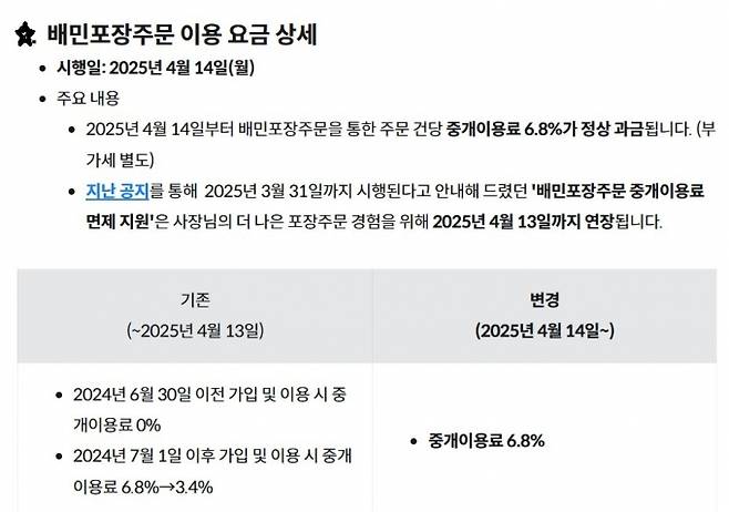 13일 관련업계에 따르면 배민은 내일(14일)부터 포장주문에 대해 1건당 중개이용료 6.8%를 부과한다. 고객이 직접 식당에서 음식을 찾아오는 포장주문을 배민 앱(애플리케이션)으로 할 경우 점주가 중개수수료를 내야 한단 얘기다. 앞서 배민은 2020년 이 서비스를 도입하고, 1년씩 유예해주는 방식으로 5년간 과금 정상화를 해오지 않다가 이번에 유료로 전환했다.