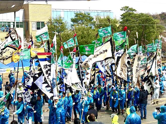 | ▲ 당진의 대표적인 축제인 ‘2025 기지시 줄다리기 축제’가 줄다리기 박물관 일원에서 개막했다. 축제 마지막 날인 13일, 박물관앞으로 행진하는 수백개의 농가와 영기 모습이 장관이다. |