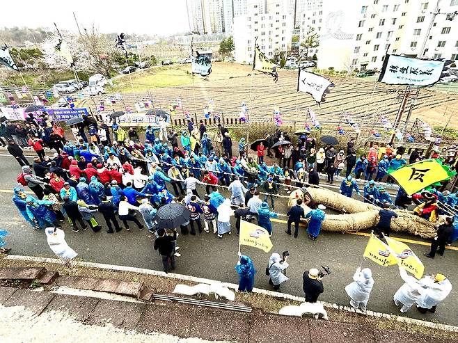 | ▲ 당진의 대표적인 축제인 ‘2025 기지시 줄다리기 축제’가 줄다리기 박물관 일원에서 개막했다. 축제 마지막 날인 13일, 관광객들이 줄을 끌고 행사장으로 이동하고 있다. |