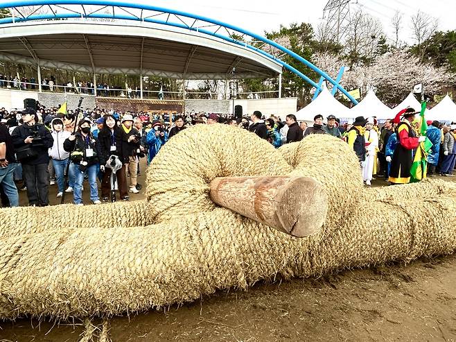 | ▲ 축제에 사용되는 수상(남성)·수하(여성) 줄은 각각 길이 100m, 무게 20t, 직경 1m로, 총길이는 200미터, 무게는 40t이다. |