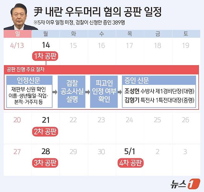 (서울=뉴스1) 김초희 디자이너 = 윤석열 전 대통령에 대한 내란 우두머리(수괴) 혐의 형사 재판이 14일 본격적으로 시작된다. 서울중앙지법 형사합의25부(부장판사 지귀연)는 이날 오전 10시 내란 우두머리 혐의로 기소된 윤 전 대통령에 대한 첫 공판기일을 연다. 공판기일 땐 당사자 출석 의무가 있어 윤 전 대통령이 직접 출석해야 한다. 첫 공판기일에는 조성현 육군 수도방위사령부 1경비단장과 김형기 특수전사령부 제1특전대대장이 검찰 측 증인으로 출석한다.