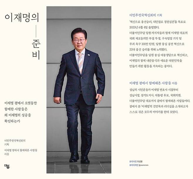 이재명 전 더불어민주당 대표 친위 조직 더민주혁신회의가 집필한 ‘이재명의 준비’가 이달 17일 출간할 예정이다. 이 전 대표의 참모들이 성남시장과 경기도지사, 대통령 후보, 국회의원, 민주당 당대표에 이르기까지의 막전막후를 기록한 책이다. 책 전반부 이 전 대표의 일화들은 기존의 자서전에도 많이 다룬 내용이지만, 후반부 행정가로서 이 전 대표가 공무원들을 어떻게 다루는지 등에 대한 일화는 새로운 편이다.
