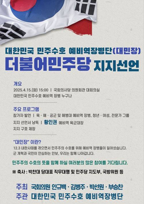 극우 진영에 5공과 하나회 세력까지 망라한 대한민국 수호 예비역 장성단, 즉 대수장이 있다면 진보 진영에는 모든 계급을 망라한 대민장이 있다며 출사표를 내는 것입니다. 민주당 측은 대민장을 12·3 내란을 겪으며 민주주의 수호를 위해 일어선 예비역 장병이라고 소개했습니다. 또 군 개혁과 국민이 안심하는 안보를 추구한다고 덧붙였습니다.
