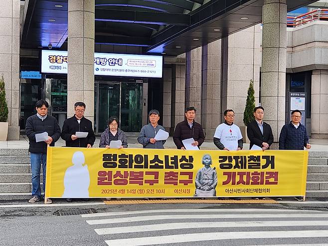 소녀상 이동 조치 소식이 뒤늦게 알려지자, 충남 아산시민들은 14일 아산시청 앞에서 기자회견을 열고 '평화의 소녀상을 원상 복구하라'고 촉구하고 나섰다.
