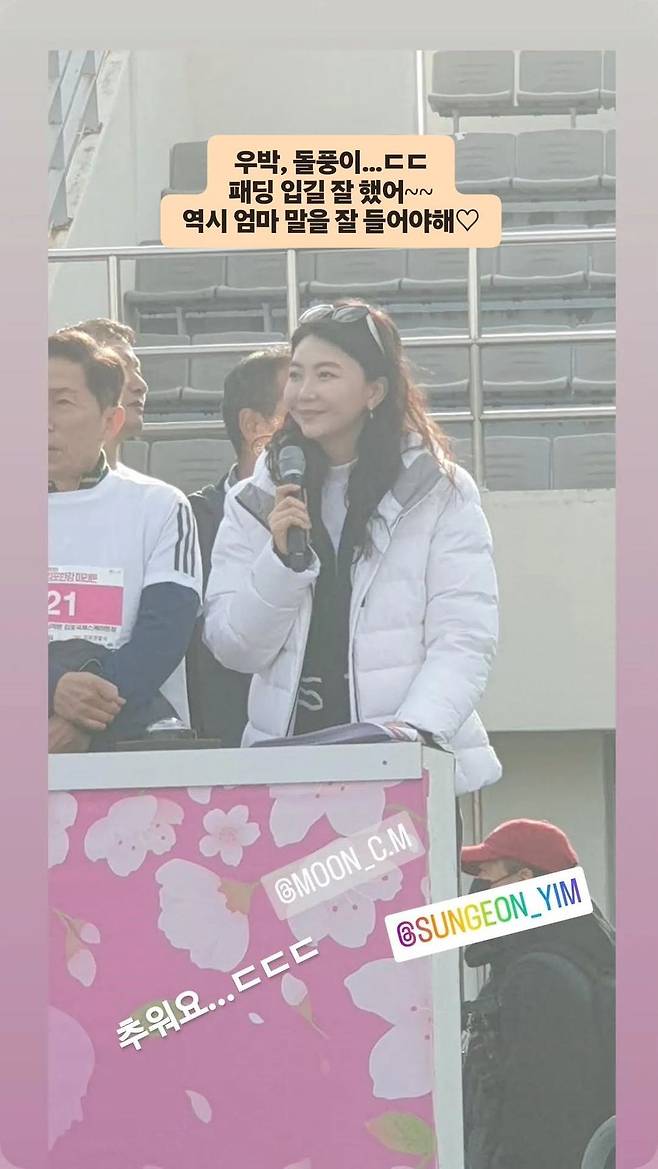 임성언은 지난 13일 개인 계정에 김포종합운동장에서 열린 제13회 김포한강 마라톤에 MC로 참여한 사진을 올렸다. 그는 "핫팩 덕분에 살았어", "추워요", "우박, 돌풍이…. 패딩 입길 잘했어.", "역시 엄마 말을 잘 들어야 해" 등 재치 있는 문구를 덧붙였다. 추위를 호소하면서도 열정을 불태우는 모습이 돋보였다.