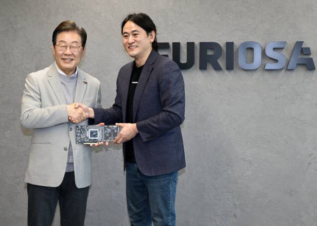 [더불어민주당 이재명 대선 예비후보가 14일 서울 강남구 퓨리오사AI에서 백준호 퓨리오사AI 대표와 악수하고 있다. (국회사진기자단=연합뉴스)]