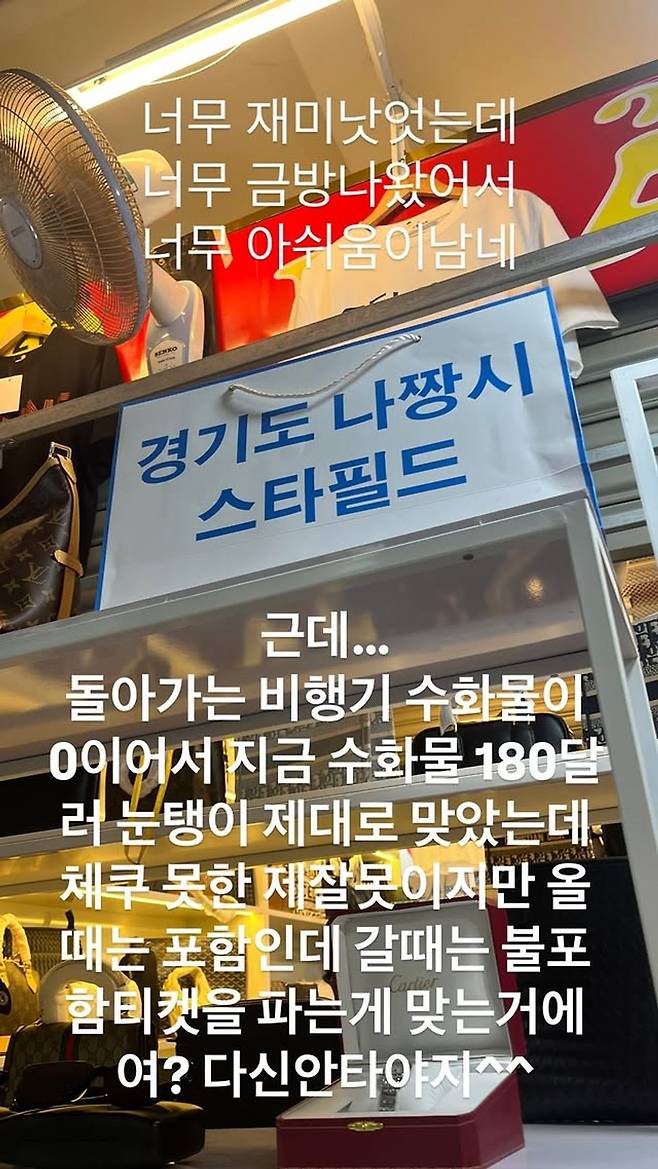 박슬기는 14일 개인 계정에 "너무 재미났었는데 너무 금방 나와서 너무 아쉬움이 남네"라는 글을 올렸다. 이어 "돌아가는 비행기에서 지금 눈탱이 제대로 맞았다. 올 때는 포함인데 갈 때는 불포함 티켓을 파는 게 맞는 거냐. 다신 안 타야지"라며 분노했다.
