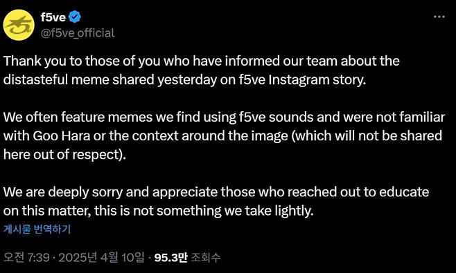 이어 "(공식 계정에서) 팬들이 제작한 밈을 자주 공유해왔다"며 "구하라가 등장한 사실을 제대로 인지하지 못했다"고 해명했다.