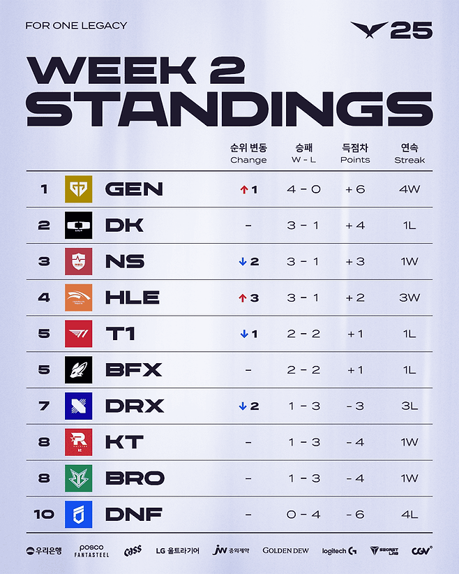 젠지가 2025 LCK(리그오브레전드 챔피언스 코리아) 정규 시즌 2주 차에서 디플러스 기아를 세트 스코어 2대1로 꺾고 개막 후 전승을 이어갔다.